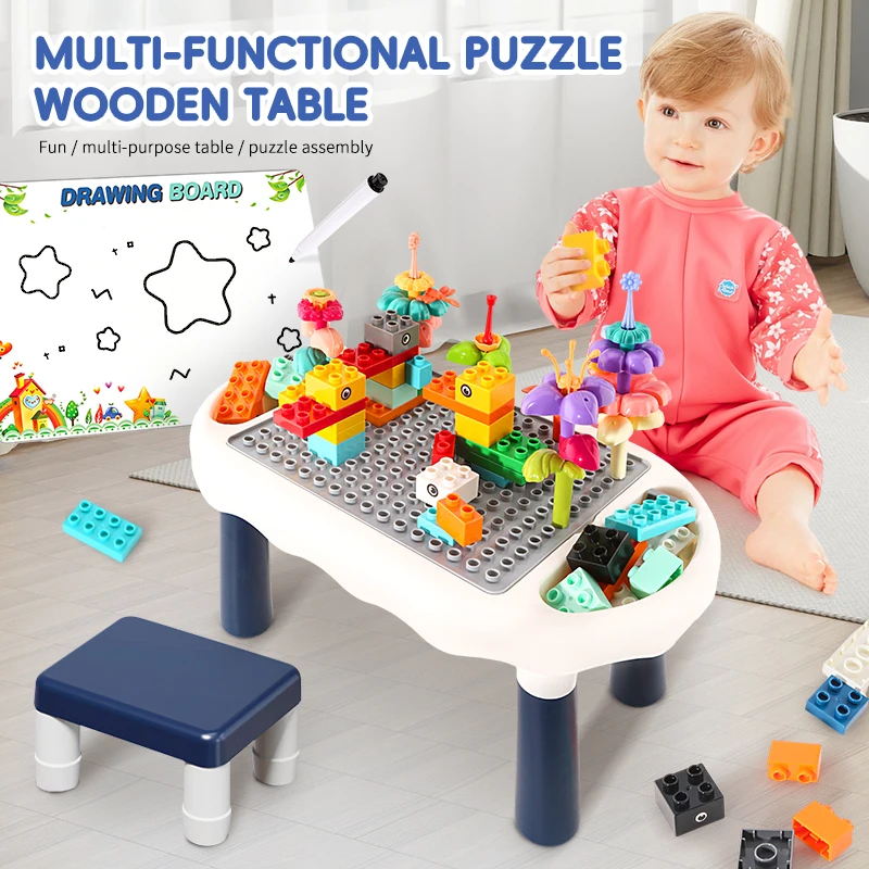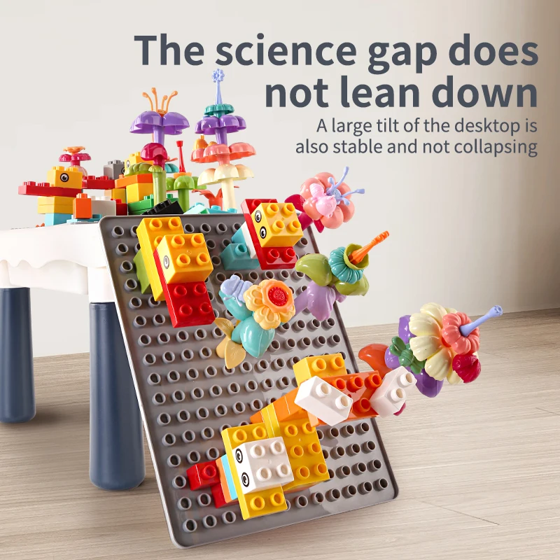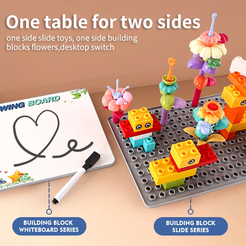 Jedna strana ploče dizajnirana je za slaganje velikih kockica, što pomaže u razvoju fine motorike, logičkog razmišljanja i strpljenja. Druga strana se lako okreće i pretvara sto u mini tablu za crtanje – idealnu za bojice, flomastere ili kredu.