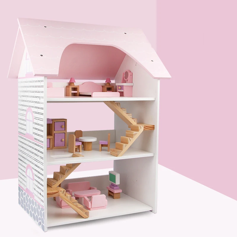 Drvena 3D vila za decu – roze kućica za lutke sa nameštajem i DIY sastavljanjem
