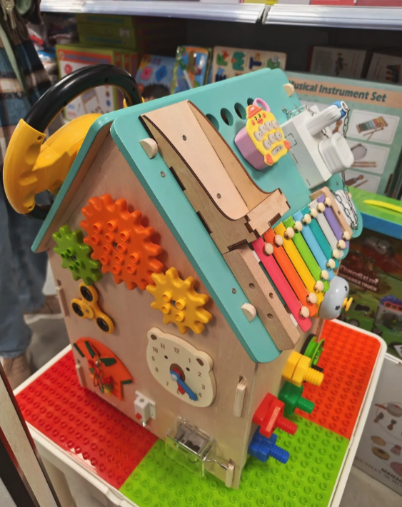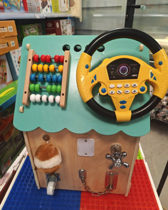 Ova edukativna kućica je dizajnirana kao Montessori aktivna tabla, poznata i kao “busy board”. Umesto klasične kuće za igru, u ovoj kućici svaka strana krije sloj interaktivnih zadataka: zupčanike, brave, kvake, prekidače, ksilofon i druge komponente. Takav dizajn omogućava da dete istražuje, rešava probleme i uči kroz igru.