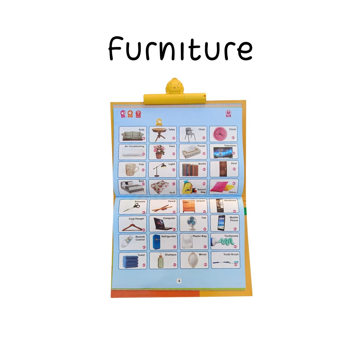 Dete klikom otkriva nazive predmeta, životinja i pojmova sa svake stranice.