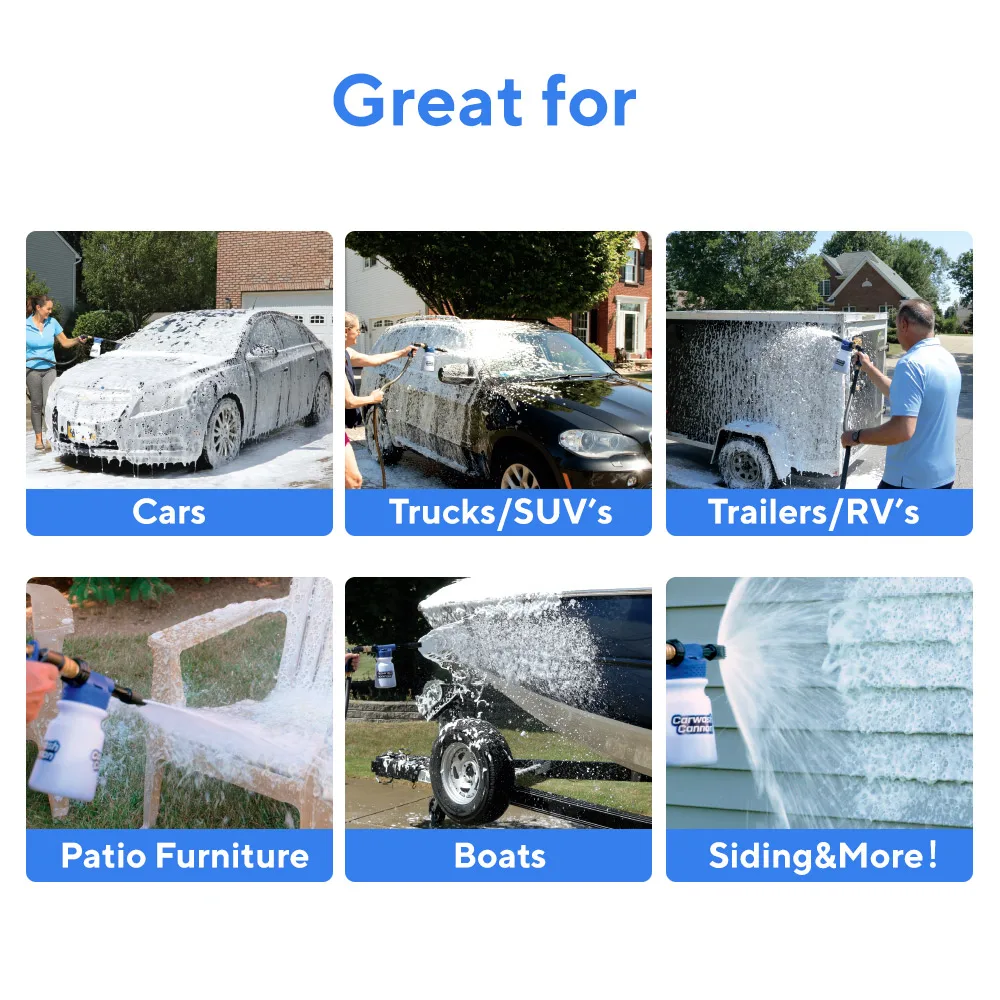 Pištolj za penu za pranje auta može se koristiti za različite vrste vozila, uključujući automobile, motocikle, kamione, čamce, kamp prikolice, ATV i druge površine koje zahtevaju temeljno čišćenje. Njegova univerzalna primena čini ga praktičnim alatom za svako domaćinstvo ili profesionalnu upotrebu.