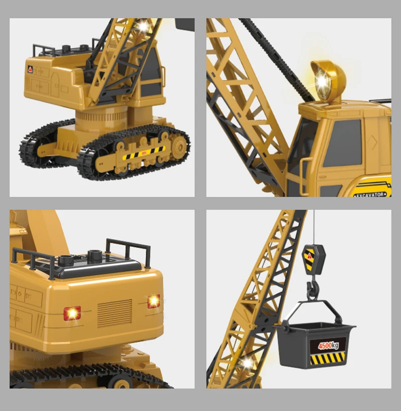 Model je izrađen sa velikom pažnjom prema detaljima: realistična kabina, rotirajuća glava dizalice, precizno reprodukovani pokreti bagera i kvalitetni točkovi doprinose autentičnosti. Dimni efekat i LED svetla dodaju dodatni nivo profesionalizma. Upravo ovakvi detalji čine da se deca osećaju kao pravi mali inženjeri na zadatku.