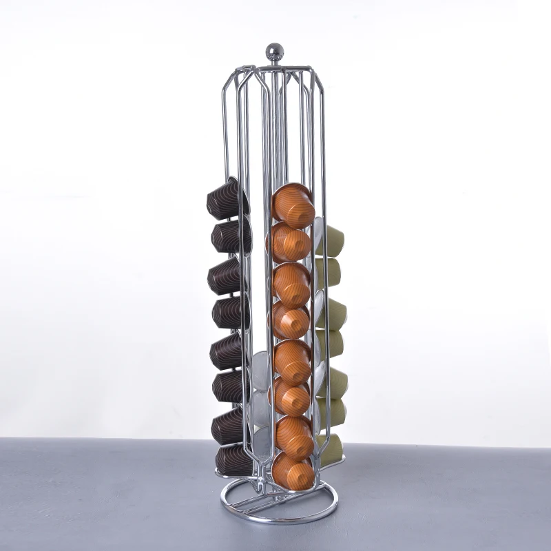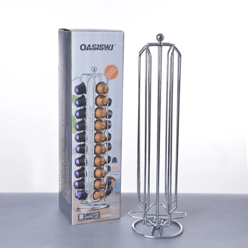 Praktičan i moderan rotirajući stalak za kapsule kompatibilan sa Nespresso Original kapsulama. Organizator za 40 kapsula sa dvostrukim nivoima i rotacijom od 360° – savršen dodatak za svaku kuhinju ili kancelariju. Napravljen od izdržljivog metala u elegantnoj srebrnoj boji.