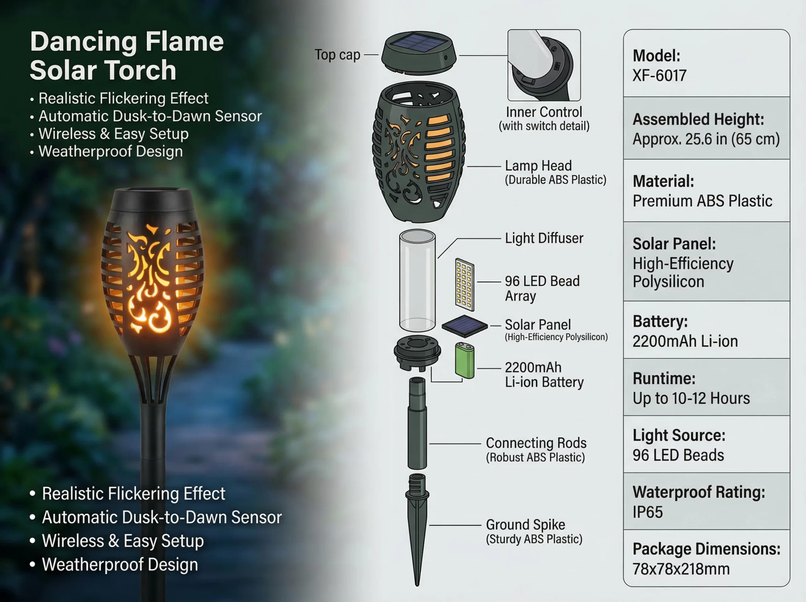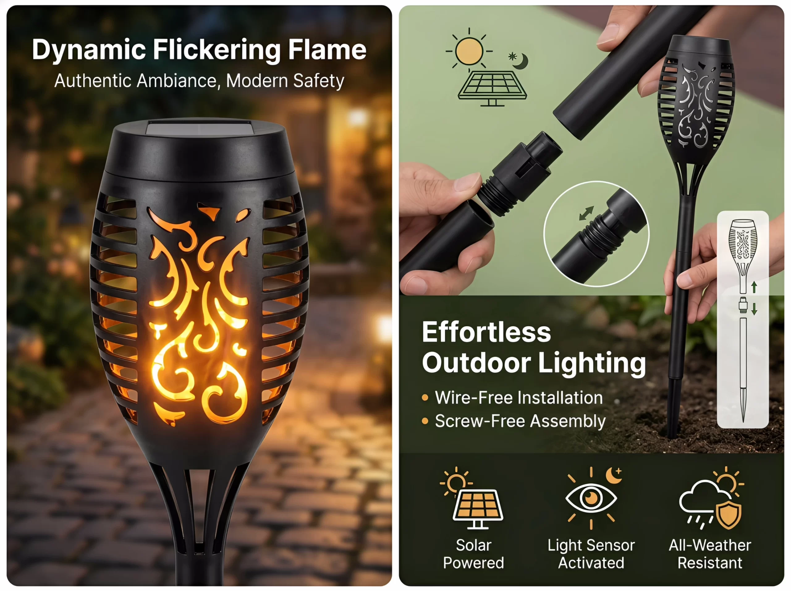 Pošto je u pitanju solar torch lamp, jasno je da ovaj model donosi izgled lampe u stilu baklje. Takav dizajn je posebno zanimljiv kupcima koji žele da spoljašnja rasveta ne bude samo jednostavna lampa, već i detalj sa izraženijim karakterom. Solarna baklja za baštu zato može biti odličan dodatak prostoru koji treba da izgleda toplije, zanimljivije i modernije.