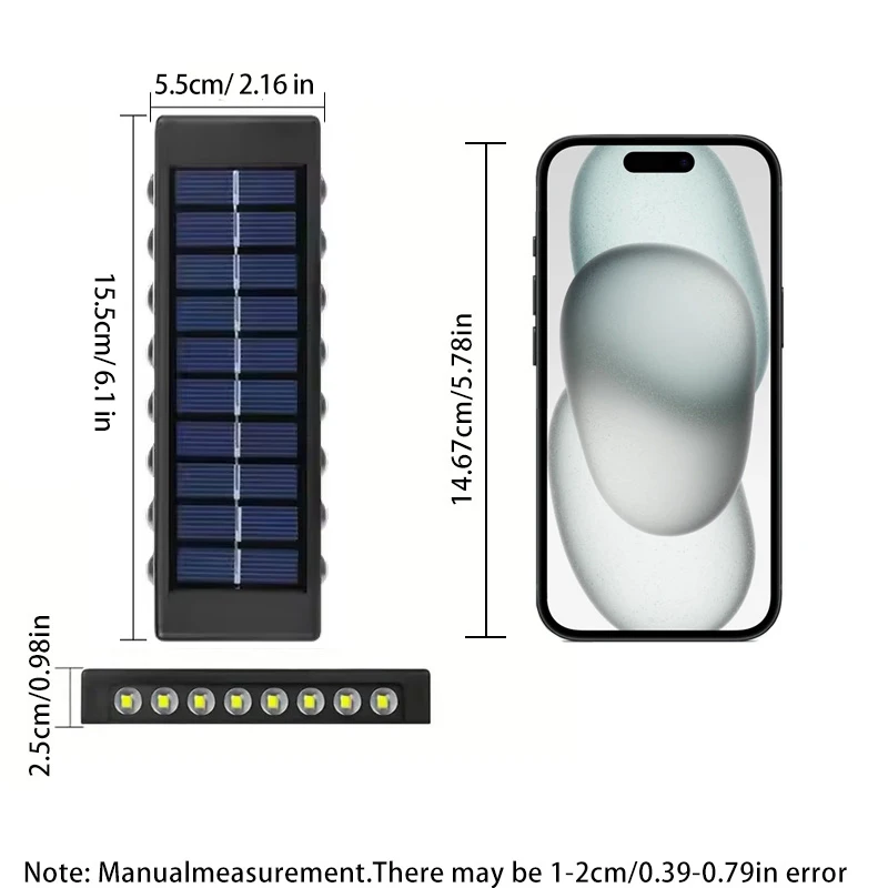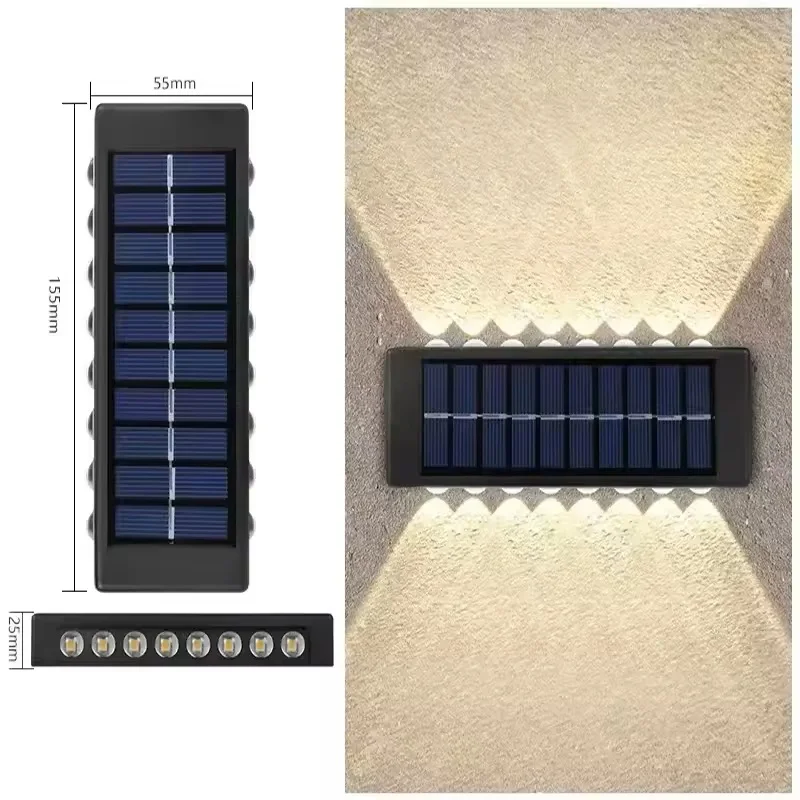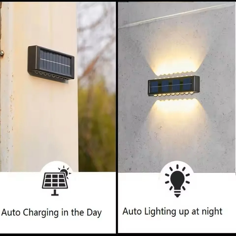 Ova solarna LED lampa za ogradu pruža usmereno svetlo nagore, što stvara moderan i elegantan efekat osvetljenja na zidovima, ogradama i spoljnim površinama.