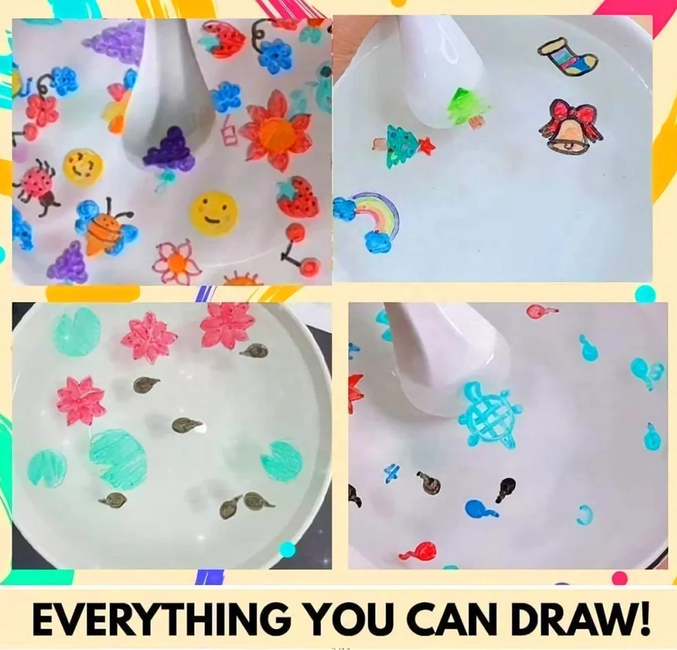 Marker je izrađen od posebnog mastila koje se ne rastvara odmah u vodi. Kada dete nacrta oblik (srce, cvet, ribicu, leptira ili bilo koji drugi motiv) na glatkoj površini i potom prelije vodom, crtež se odvaja i počinje da pluta. Ovaj efekat je bezbedan, zabavan i izuzetno privlačan za decu, jer spaja umetnost i nauku u jednoj igri.