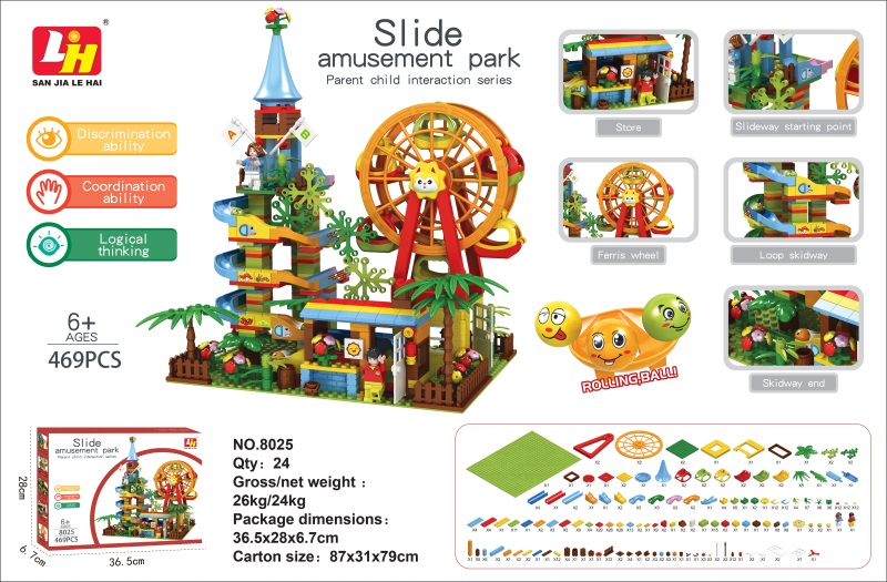 Set „Zabavni luna park“ donosi pravi mali svet zabave u obliku kockica za slaganje. Sa 469 delova različitih boja i oblika, deca mogu da naprave kompletan luna park — od ringišpila i tobogana do dekorativnih detalja i malih tematskih delova. Igra je izrazito interaktivna i podstiče kreativnost jer se ceo park može stalno preuređivati.